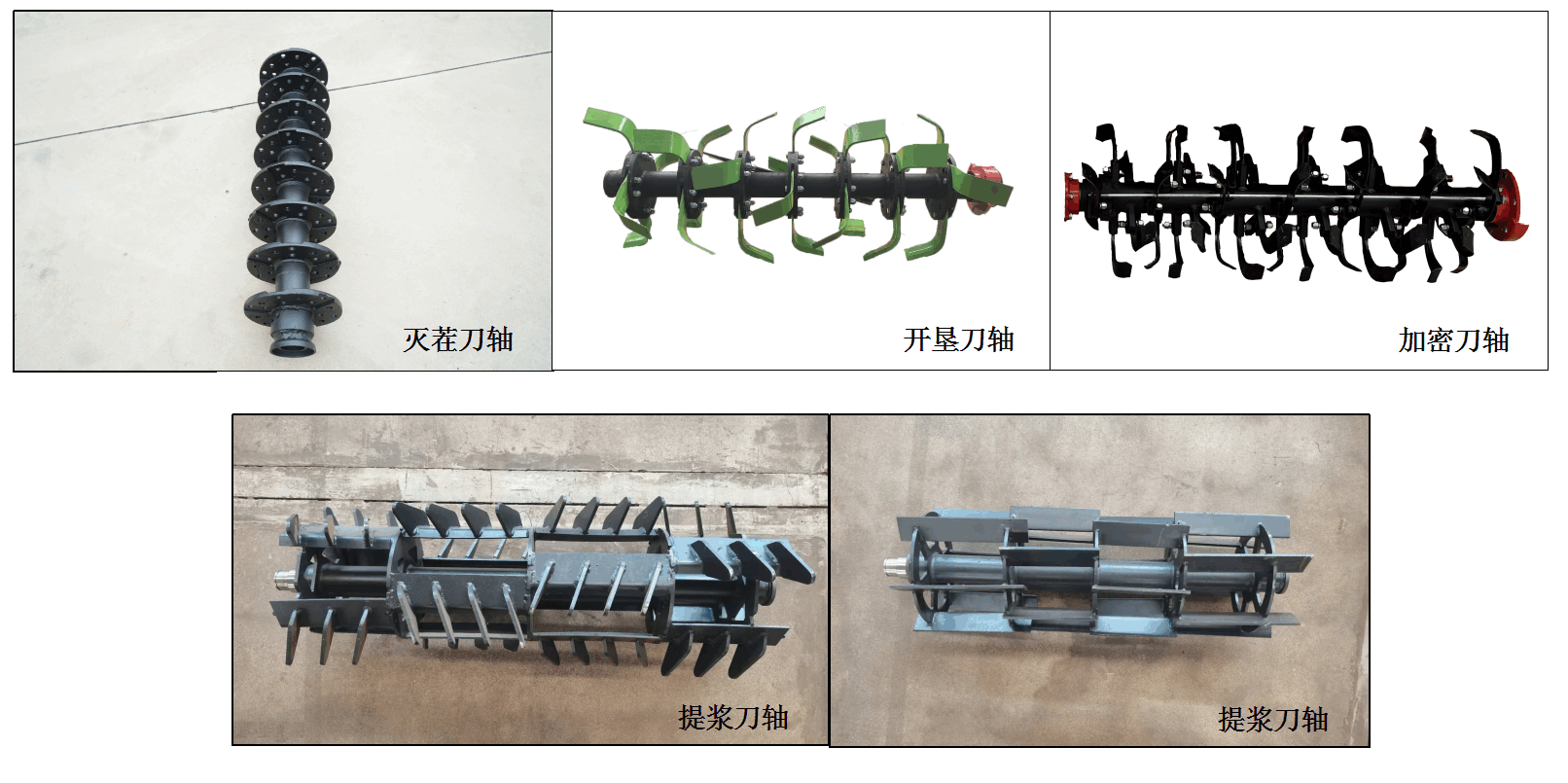 可根據水旱田及農藝需要配制:滅茬刀軸、開墾刀軸、提漿刀軸、加密刀軸。