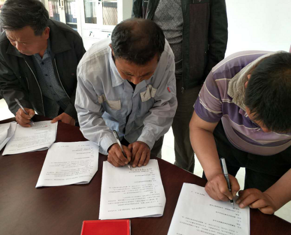 在縣百企辦逯亞森主任、大河屯鎮黨委張珀副書記、申沖村申慶振主任的見證下,各方與公司共同簽署了相關協議,正式將本批物資轉交給了申沖村委。