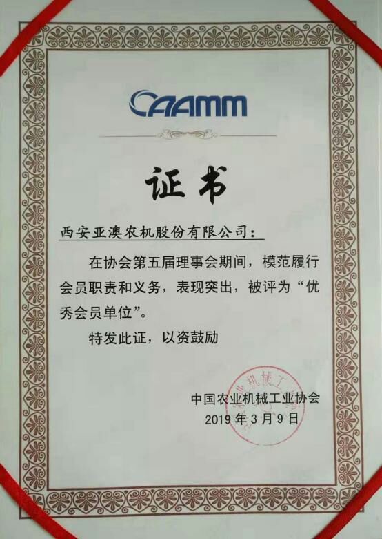 亞澳農機榮獲中國農機工業協會“優秀會員單位”