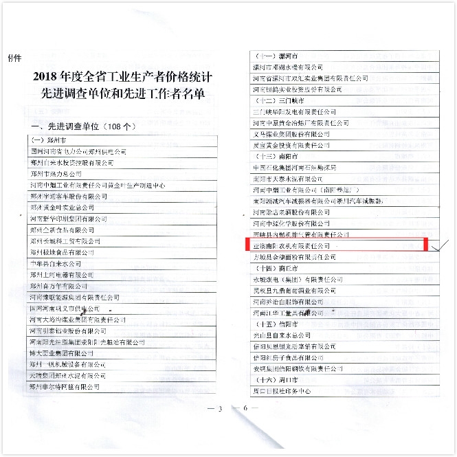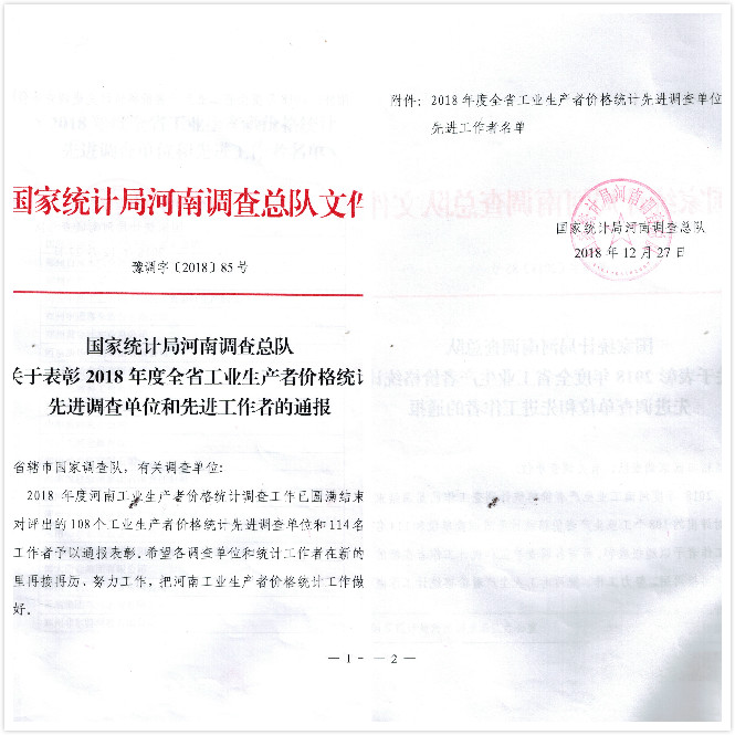 日前,自國家統計局河南調查總隊獲得消息,亞澳農機獲得2018年度全省工業生產者價格統計先進調查單位。