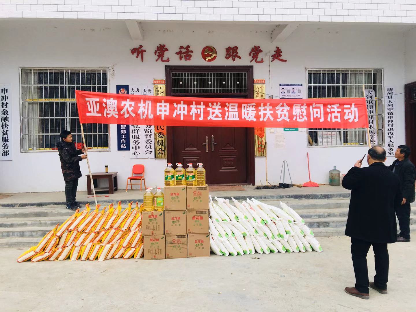 為積極貫徹落實唐河縣委縣政府”百企幫百村”的扶貧工作精神,履行企業社會責任,按照縣扶貧辦工作統一部署,亞澳農機結合對口幫扶的申沖村實際情況,因地制宜,統籌規劃,務求實效,在2018-2019年開展了一系列的扶貧幫困工作。