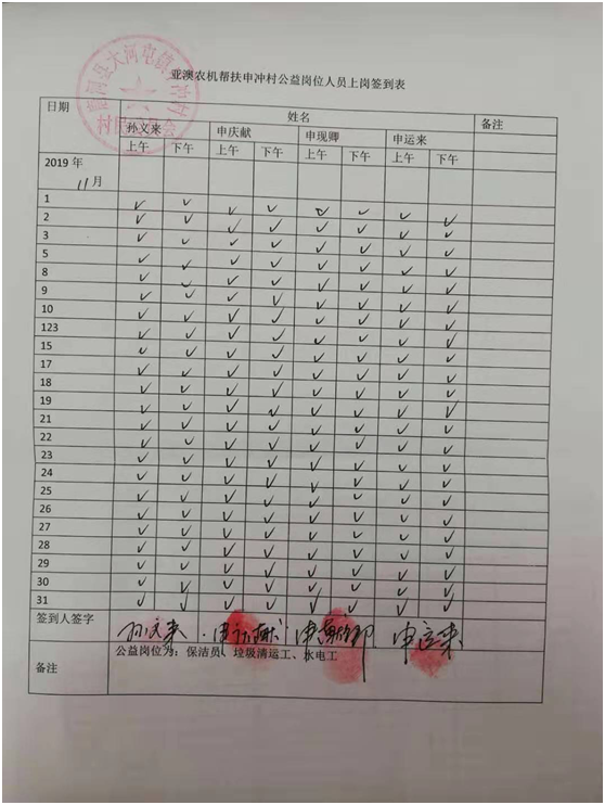 亞澳農機每月給公益崗位貧困戶工作人員發放工資500/月人