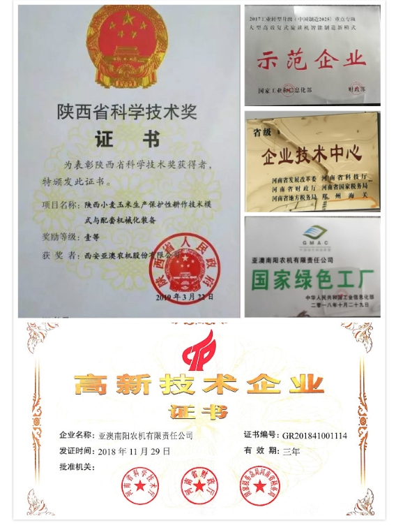 亞澳農(nóng)機堅持“產(chǎn)品就是人品、內(nèi)在是我心、外在是我臉”的品質原則,多功能變速旋耕機、旋播施肥機、聯(lián)合耕整機、雙軸滅茬機、精量免耕播種機、深松機等產(chǎn)品在耕整機械(主機配套40-300馬力)領域處于行業(yè)前列, 累計取得自主專利78項。2018年“亞澳”商標獲得中國馳名商標,產(chǎn)品多次被中國農(nóng)機化協(xié)會、中國農(nóng)業(yè)機械流通協(xié)會、中國農(nóng)業(yè)機械工業(yè)協(xié)會授予“AAA級信用企業(yè)”、“技術進步獎”、“產(chǎn)品創(chuàng)新獎”、“全國農(nóng)機用戶滿意品牌”、“最具影響力品牌”,被國家相關部委單位授予農(nóng)業(yè)部科技進步三等獎、星火計劃金獎、西安市科技進步一等獎、陜西省行業(yè)之星企業(yè),“專精特新”中小企業(yè),南陽市級科技百強企業(yè)等多項殊榮;國家型高新技術企業(yè),在農(nóng)機行業(yè)中具有較高的美譽和知名度,得到了社會的廣泛認可。