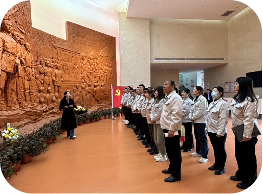 活動現場、各位員工代表手持鮮花列隊肅立在莊嚴的烈士紀念碑前,依次將鮮花擺在紀念碑石階上,駐足凝視、以寄哀思,隨后全體鞠躬、默哀,向革命先烈們致以崇高的敬意、表達無限的緬懷之情。