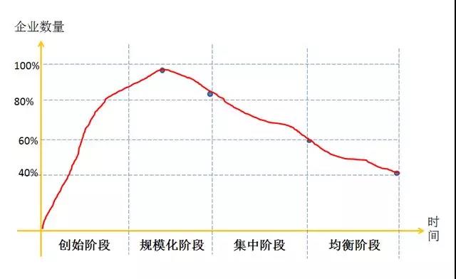 在一個行業,從長期看,企業要存活下來就要有超出平均水平的成本控制能力。管理學家陳春花認為一個行業內企業數量和時間軸之間的關系可以通過四個發展階段來說明:初創階段、規?;A段企業數量一直上升,規?;笃谄髽I數量達到頂峰,開始有擠出效應,約20%企業出局,到集中階段又有20%企業出局,到均衡階段還要淘汰20%,最后的競爭就在剩下的40%企業之間展開。